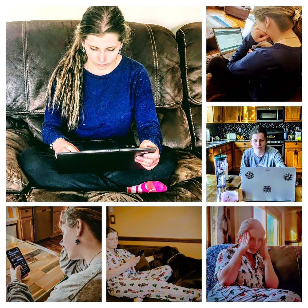 Top Left: On Saturday morning, Mar. 4, 2026, Social Work major Gabriella Stoinski, 22, works on an online assignment for her Criminal Justice course. She sits cross-legged on her couch, holding her computer, as she works. As Stoinski said about the image, “In the first image, I was working on an assignment online for my Criminal Justice course, which I’m currently taking at Saginaw Valley State University. I was ready to be done with the assignment, it was due the next day, so I wanted to get it finished on time”.